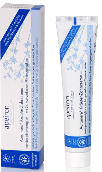 Apeiron Pasta do zębów naturalna z 24 ziół Ajurwedyjskich bez mięty i fluoru 75 ml dzięki swojej unikalnej, hipoalergicznej formule zapewnia czystość i dobrą kondycję jamy ustnej. Organiczne mikro drobinki usuwają kamień nazębny, nie szkodząc szkliwu.